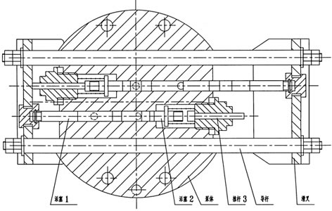 泵體內二組活塞,每組活塞由1個工作塞和2個控制活塞組成,當一組活塞中的工作活塞完成吸油過程時,另一組活塞中的工作活塞則把潤滑脂壓向出油口。如下圖所示,當滑叉向左運動時,上組活塞完成吸油,下組活塞完成壓油,開始新的工作循環。這時下組活塞1、2向左運動,活塞2在彈簧力作用下到達極限位置關閉出口,而活塞1繼續向左運動,這時活塞2和1之間形成真空,其真空度隨活塞1的左移不斷增大,滑叉運動到極限位置活塞1打開吸油口,潤滑脂從吸油口吸入,如彈簧力不足,沒將活塞2推到極限位置,此時推桿3會在滑叉的推動下強制地把活塞2壓到極限位置,同時上組活塞1、2、3向左運動,活塞1先關閉吸油口,被吸入的潤滑脂在活塞1的推動下向左移動,當活塞2把出油口打開時,活塞2和推桿3 的運動也就停止,活塞1繼續左移,把潤滑脂從出油口壓出,活塞1、2接觸滑叉也已運動到極限位置完成半個循環的工作,如此周而復始地循環,二組活塞交替地將潤滑油脂從出油口壓送出來,壓出的潤滑脂經泵裝置連接法蘭上的過濾器過濾后向系統供送。
