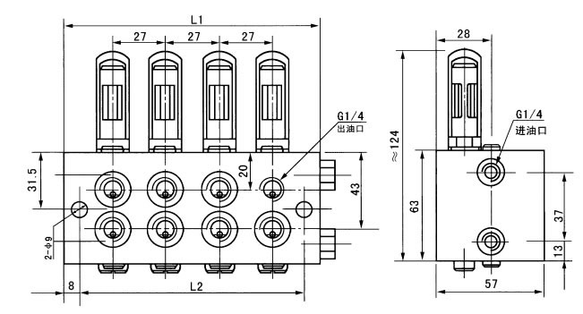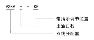 VSKV-KR型雙線分配器正面設(shè)上下二排出油口,分配器活塞正反向動作時分別從上排和下排的出油口排出潤滑脂。還可以從指示桿的動作直接觀察分配器的工作情況,并可通過調(diào)整螺釘在規(guī)定范圍內(nèi)調(diào)整出油口的給油量。