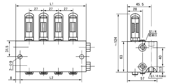 分配器適用于公稱壓力為40MPa的雙線式干油集中潤(rùn)滑系統(tǒng)中。它在兩條供油主管交替的供油壓力作用下,直接由供油壓力控制活塞動(dòng)作給油,完成向潤(rùn)滑點(diǎn)定量分配潤(rùn)滑脂的功能。
