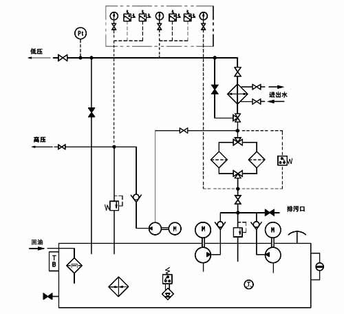 本產品主要由油箱(其內裝有磁網過濾器)、低壓油泵裝置、高壓油泵裝置、雙筒網片式過濾器、手動高壓油泵、冷卻器、管道、閥門、儀表盤及電控柜等組成。