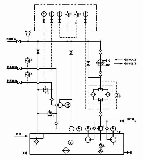 本產(chǎn)品組成部分也和普通高(低)壓稀油站相同;僅比它多一臺高壓油泵,二臺高壓油泵的吸口均聯(lián)于低壓泵的供油口;二臺高壓泵均啟動時,要從低壓供油口吸走5L/min的潤滑油,對低壓泵流量較小者,啟動高壓泵時低壓供油壓力可能會有所降低,對潤滑油均供向同一軸承的系統(tǒng)來說,軸承的潤滑油總量并未減少,不會影響對軸承的潤滑;但啟動高壓泵時,低壓壓力的降低可能造成備用低壓泵會臨時啟動,這種情況也不致影響潤滑系統(tǒng)的正常工作;但采用二低壓泵互相切換的備用工作方式時,可能工作泵停止后,備用泵流量仍不滿足要求時就不能使?jié)櫥到y(tǒng)正常工作了;故選用較小流量低壓泵時應注意這一情況。